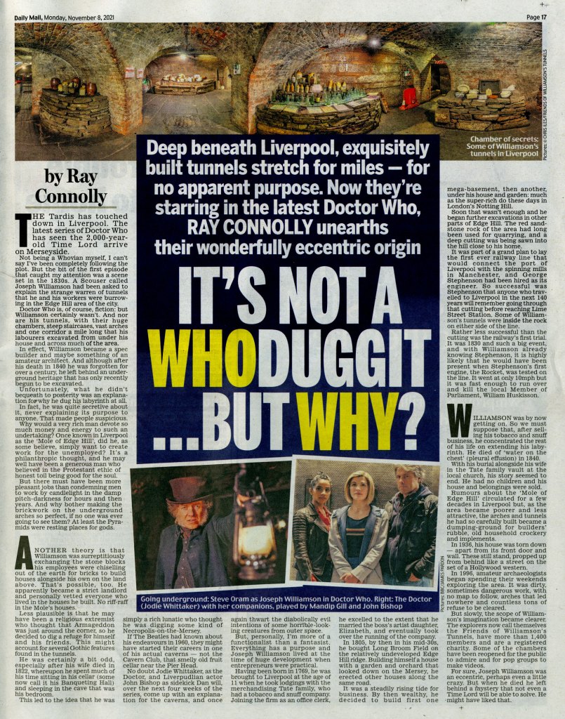 The full page article, featuring the Williamson’s Tunnels, and FoWT in the new Doctor Who series.