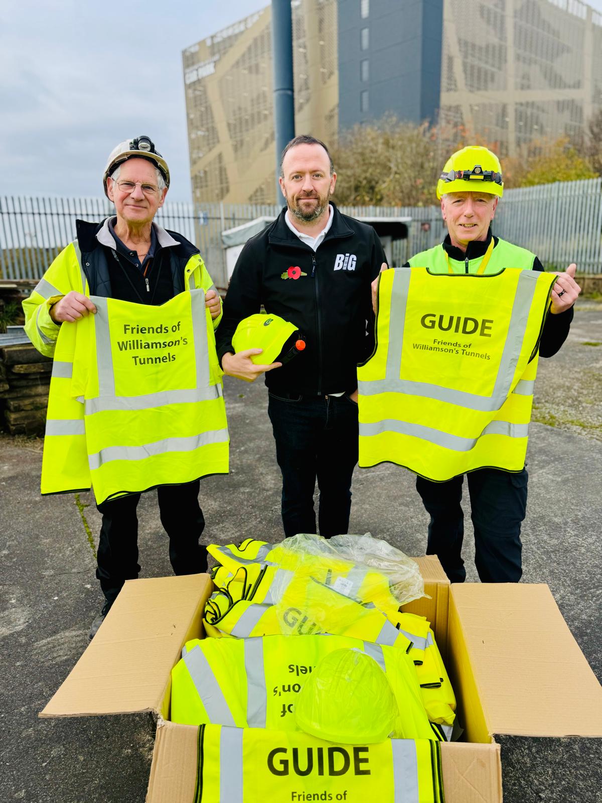 On Wednesday 6th November, the Trustees and Volunteers of the Friends of Williamson’s Tunnels, took delivery of a large batch of new PPE equipment. The donation included Hard Hats and Hi-Viz jackets, for the use of our expanding number of visitors to the tunnels.